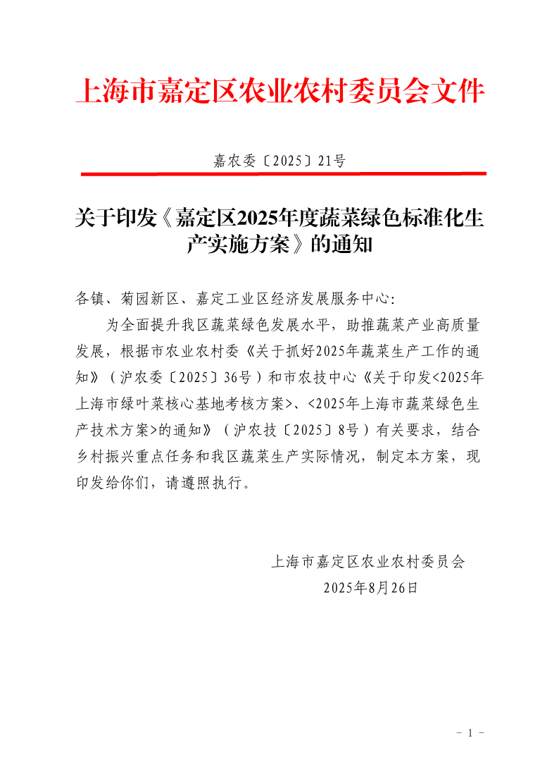索引号: 00001434-9/2025-00000080 发布机构: 区农业农村委 发文日期: 2025年08月26日 文 号: 嘉农委〔2025〕21号 关键词: 主题分类: 政府文件 关于印发《嘉定区2025年度蔬菜绿色标准化生产实施方案》的通知 发布时间:2025-08-26 浏览次数: 次 【字体:小 大】